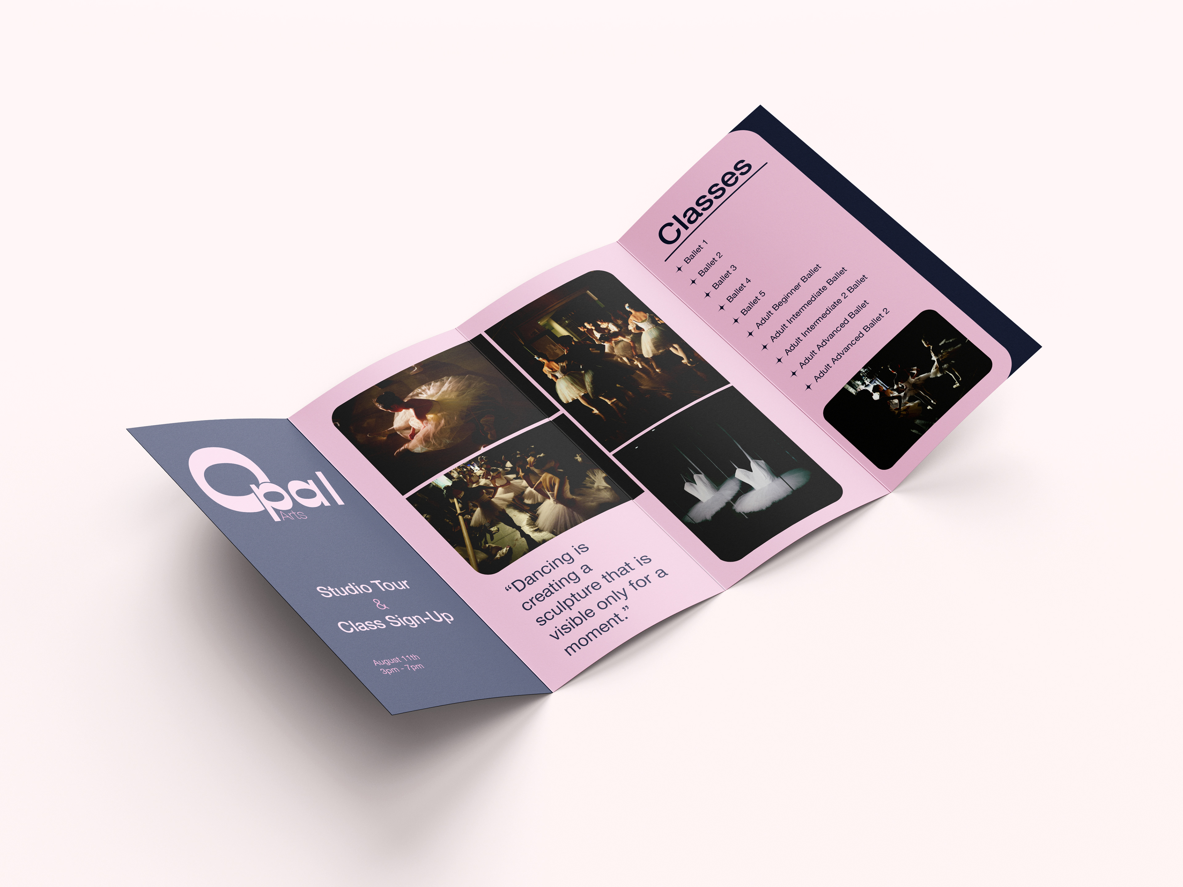 Opal Arts is a new ballet studio hoping to inspire all through movement. For the branding I wanted to use a clean san-serif logo, and use add in some subtle colors. Using a pink color, like traditional ballet tights, and some rich blues to contrast.
